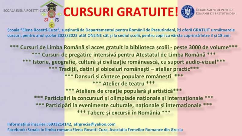 CURSURI GRATUITE - Vă așteptăm la înscrieri pe tot parcursul anului (atât în format fizic cât și online)! Școala in limba romana Elena Rosetti-Cuza oferă cursuri gratuite de limba română, istorie, geografie, tradiții și obiceiuri românești, dansuri populare dar și ateliere de creație (pictură pe ceramică, icoane pe sticlă, țesut, gastronomie tradițională) etc.